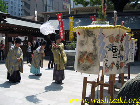 三福神のそれぞれの行列には,鮮やかな傘鉾が3本ずつ付きます。この傘鉾は,事前に櫛田神社に「御神入れ」され,神さまを宿しています(写真下)。そして,この下を通ると,無病息災の御利益があるとされています。 |