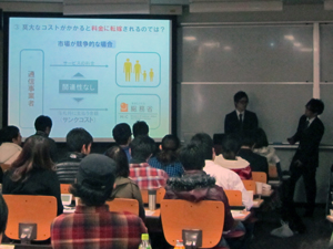 イケメン・トリオの報告者たちが「スーツ姿に黒縁眼鏡」という出で立ちで揃え,ジャパニーズ・ビジネスマンっぽさをビジュアル的に訴えた点は,オーディエンスからも好評でした。 |